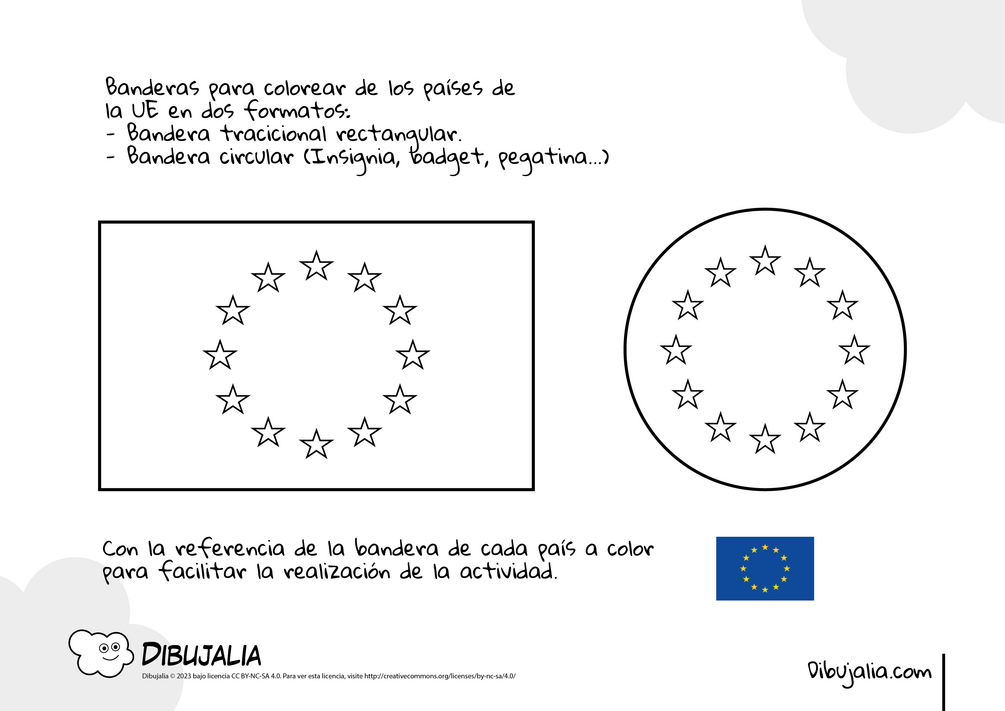 Un cuadernillo en PDF con las banderas de los 27 paises y la UE en dos formatos listas para imprimir y colorear.
